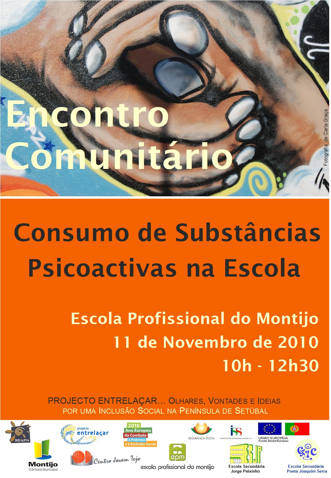 No âmbito do Projecto Entrelaçar, realiza-se mais um encontro comunitário desta vez subordinado ao tema " Consumo de Substâncias Psicoactivas na Escola". A iniciativa tem lugar na Escola Profissional do Montijo dia 11 de Novembro, entre as 10 e as 12.30 horas.