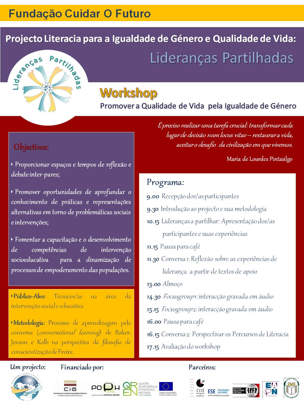 “Lideranças partilhadas – promover a qualidade de vida pela igualdade de género” assim se intitula o workshop que terá lugar no auditório da EAPN Portugal, um dos promotores da iniciativa organizada em parceria com a Fundação Cuidar o Futuro. Agendado para o dia 24 de fevereiro, o evento foi desenvolvido no âmbito do projeto “Literacia para a Igualdade de Género e Qualidade de Vida: Lideranças Partilhadas”. As inscrições, gratuítas e obrigatórias, estão abertas até ao próximo dia 22 de fevereiro, com limite de 20 participantes. O workshop repete-se dia 16 de março, em Vila Real.