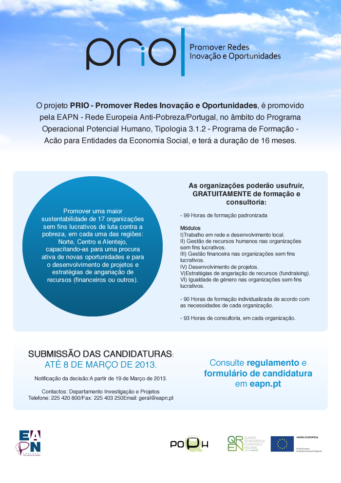 O projeto PRIO – Promover Redes Inovação e Oportunidades, é promovido pela EAPN - Rede Europeia Anti-Pobreza/Portugal, no âmb...ito do Programa Operacional Potencial Humano, Tipologia 3.1.2 – Programa de Formação – Acão para Entidades da Economia Social, e terá a duração de 16 meses.