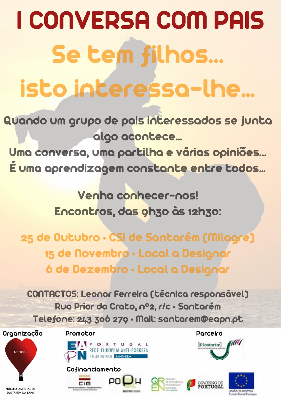 Conversa com pais novembro 06, 2013 Obter link Facebook Twitter Pinterest Email Outras aplicações + INFO: Projeto Afetos + EAPN Portugal/Rede Europeia Anti-Pobreza afetosmais@eapn.pt Rua Prior do Crato, nº 2 , 2005-364 Santarém Telefone: 00351 243306279; www.eapn.pt