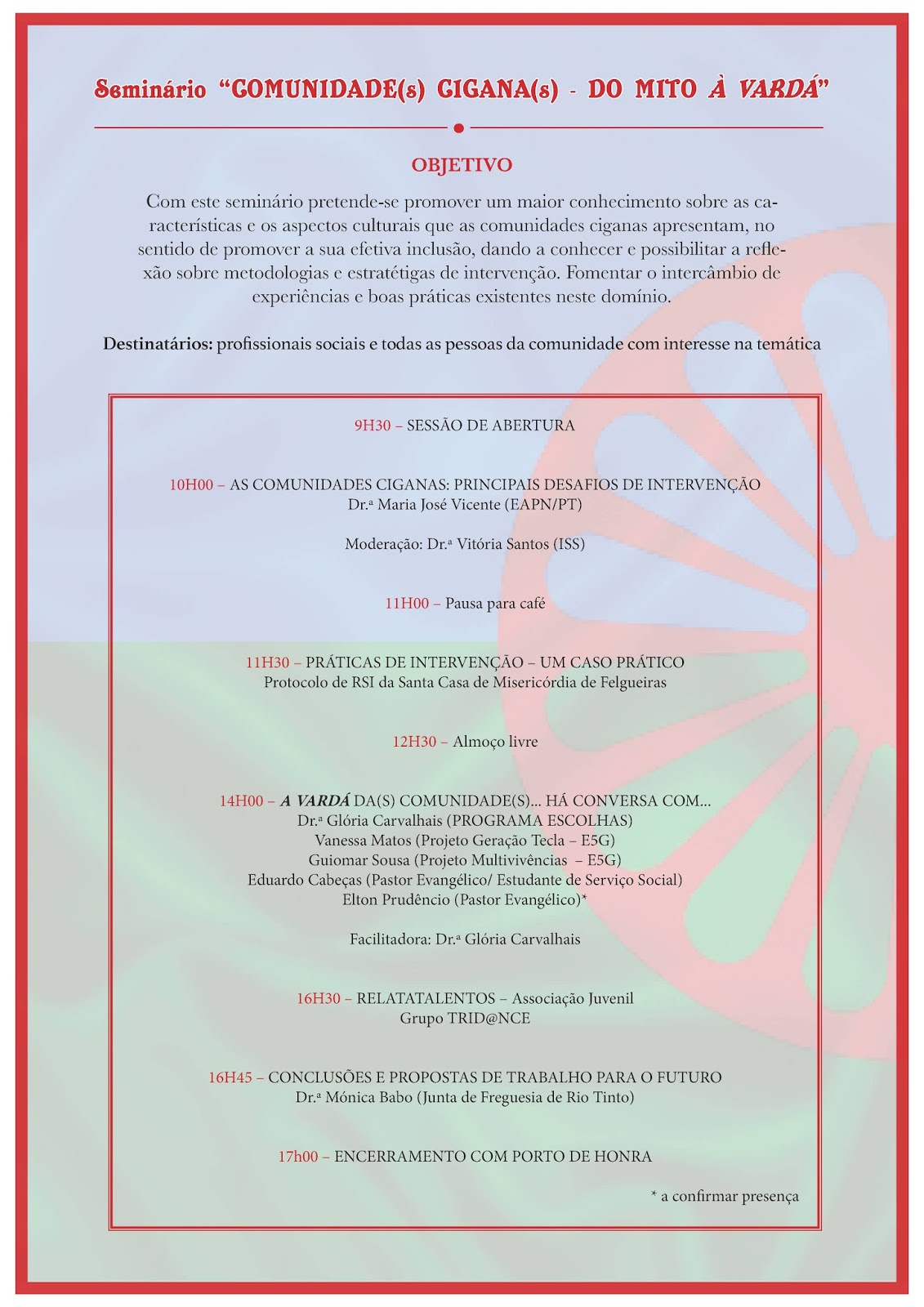 « Esta iniciativa surge da articulação entre o Projeto A ESCOLHA É TUA! – E5G, as Equipas de RSI do Centro Social de Soutelo, Associação Nuno Silveira e Santa Casa da Misericórdia de Vera Cruz, EAPN/PT, Junta de Freguesia de Rio Tinto e Projet’Arte. Tem por objetivos: Promover um maior conhecimento sobre as características e os aspetos culturais que as comunidades ciganas apresentam, no sentido de promover a sua efetiva inclusão; Dar a conhecer e promover a reflexão sobre metodologias e estratégias de intervenção; Fomentar o intercâmbio de experiências e boas práticas existentes neste domínio.