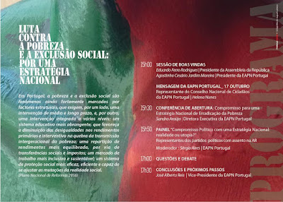 Por ocasião de uma data fundamental como o 17 de outubro e com a presença de representantes destes grupos de cidadãos na Sala do Senado da Assembleia da República, a EAPN Portugal propõe-se organizar um debate subordinado ao tema a “Luta contra a Pobreza e a exclusão social: por uma estratégia nacional” , onde serão ouvidos e interpelados os partidos políticos com assento parlamentar.